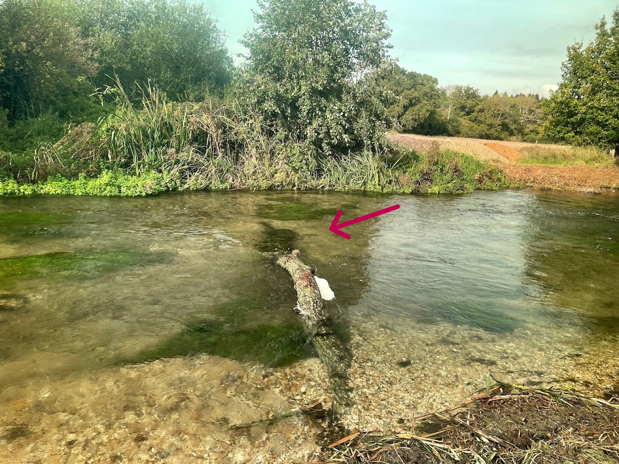 Elsewhere, up and downstream, large numbers of bankside trees were either felled or hinged into the river. In areas where there were no trees present, we transported them to the river from nearby woodland. In channel woody features like these create a diversity of flow, scour the gravel clean and also provide lots of cover for juvenile and adult fish alike. It doesn't take resident fish long to take advantage of these new habitat features.This good-sized wild trout showed up within 24 hours of us placing this new woody feature on site (image above).